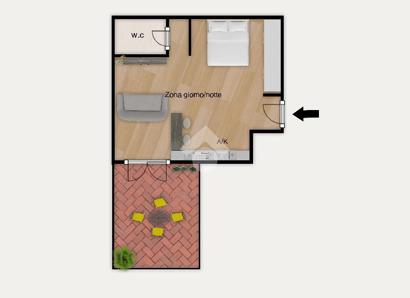 Via del Maggiolino, in comprensorio privato di recente costruzione, proponiamo in locazione ampio monolocale interamente arredato composto da zona giorno/notte, disimpegno, bagno non finestrato e corte privata mattonata. Completa la proprietà il posto auto privato scoperto.